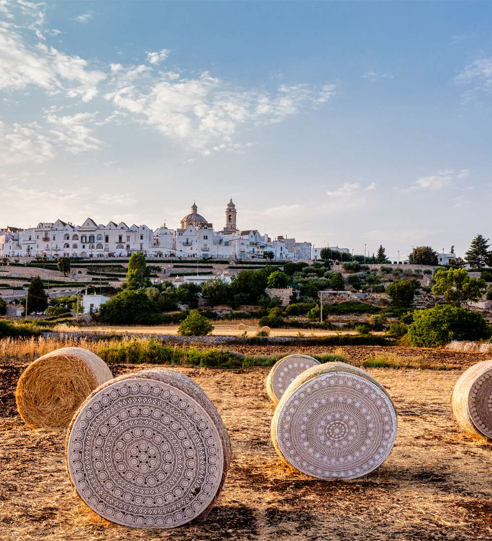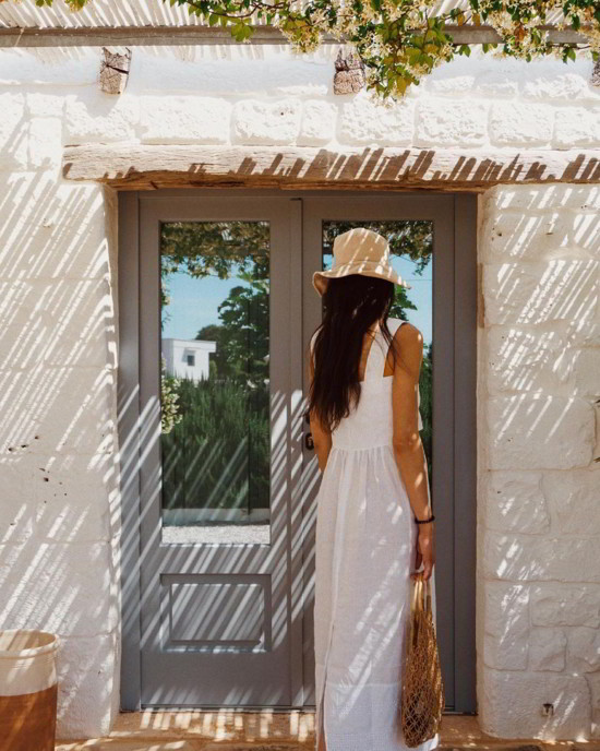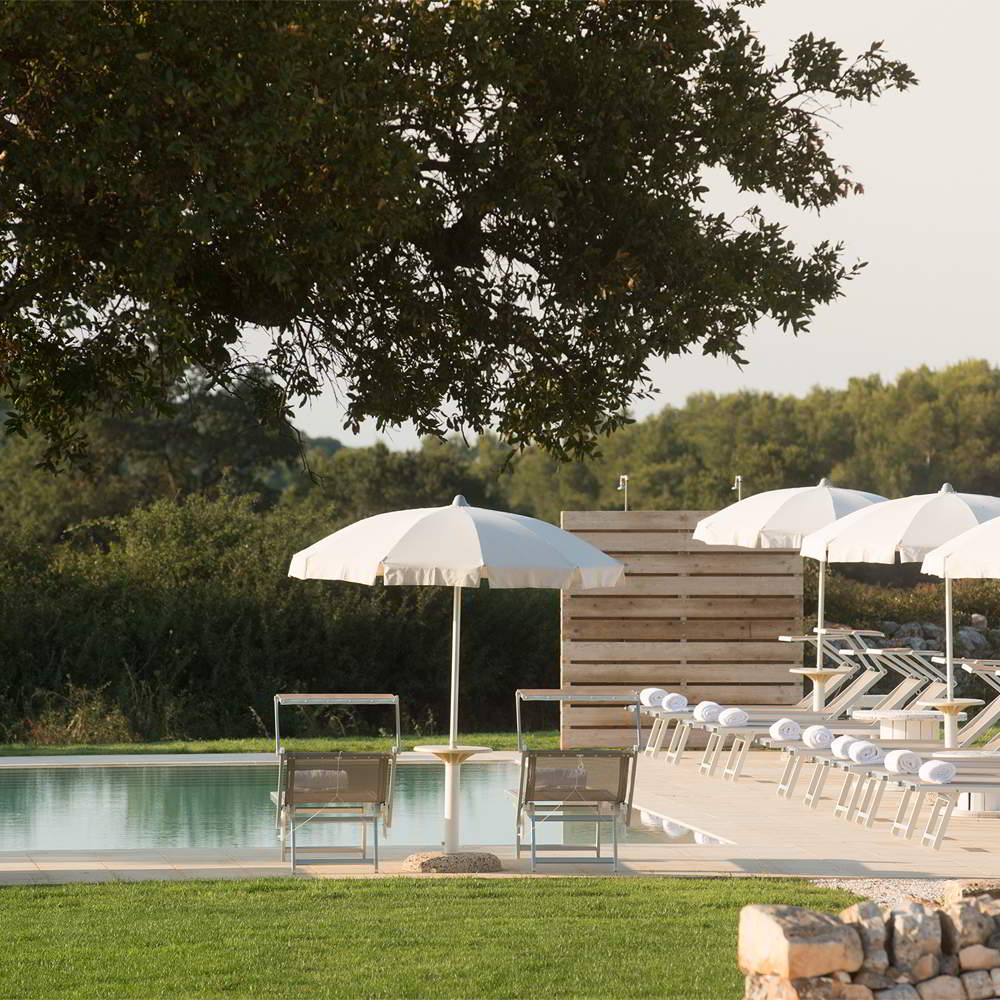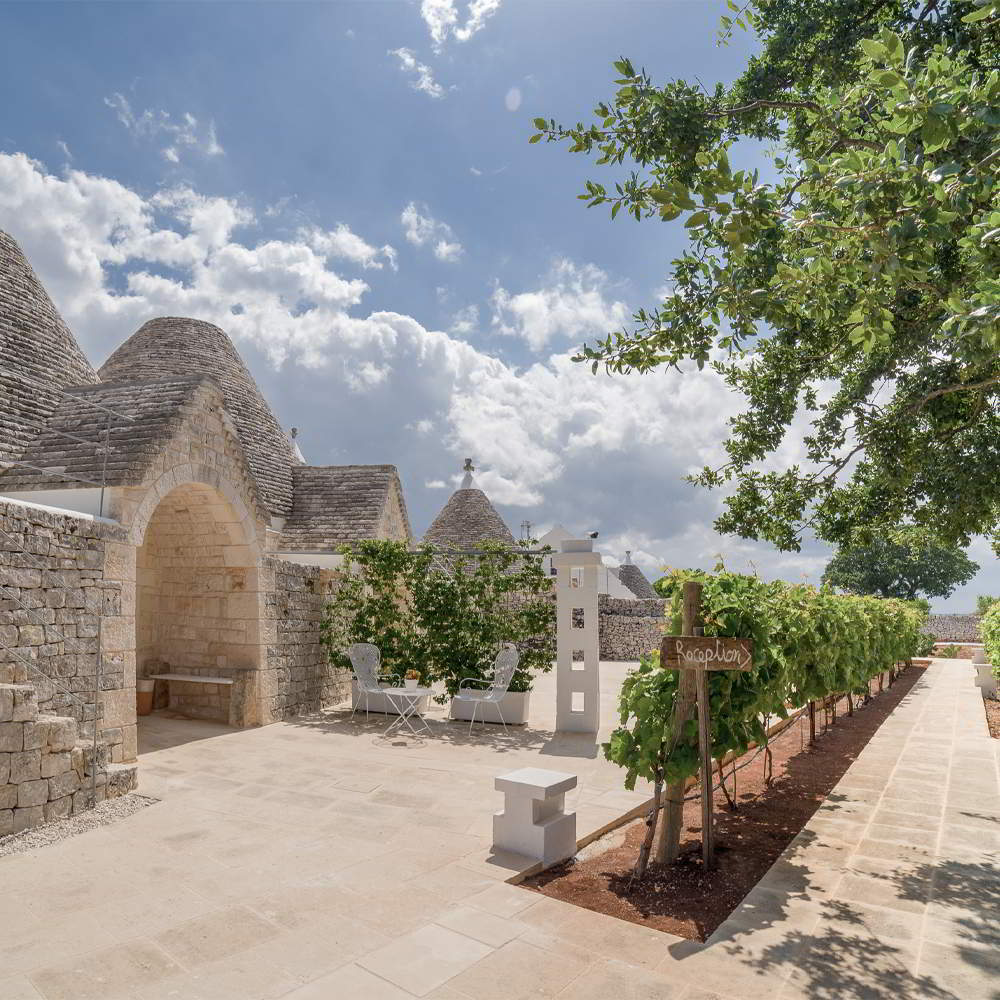 Una masseria di trulli nella campagna di Monopoli, circondata da vigneti ordinati e lecci protettori, orizzonti lunghi fino al mare e cieli altissimi. E il desiderio di raccontare il lusso della semplicità. Di coccolare con la bellezza del riposo e del silenzio. Lasciando spazio alle emozioni dei panorami, dei tetti a cono, dei sapori antichi. All’oblio dei ritmi lenti, delle passeggiate per tratturi, della raccolta delle verdure dell’orto, dell’orologio delle stagioni, della vendemmia e della salsa di pomodoro, dei passatempi dettati dalle luci del sole o dal cielo trapuntato di stelle.